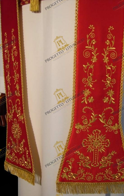 Protagonista della decorazione della stola pastorale rossa è senz'altro il raffinato ricamo dal motivo floreale posto alle due estremità della stola. Fulcro dei ricami, del colore dell'oro, sono le due croci attorno a cui si sviluppa tutto il disegno caratterizzato da germogli e fiori.