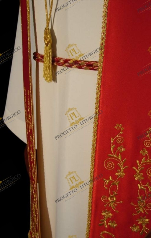 E' realizzata con prezioso tessuto mikado di seta questa stola pastorale rossa, ideale per le celebrazioni liturgiche in cui è richiesto il colore rosso dello Spirito Santo o del martirio.