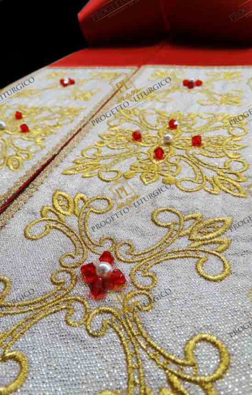 Cristalli rossi e perle bianche sono cucite a mano per mettere in evidenza alcuni particolari del ricamo, rendendo questa una stola sacerdotale bianca preziosa e solenne