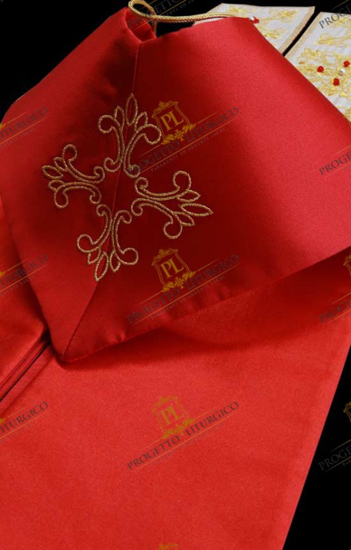 Questa stola sacerdotale bianca è realizzata in pregiata seta shantung e foderata con tessuto di raso dorato. La decorazione della stola è costituita da un bellissimo ricamo realizzato con filato dorato su tessuto di lana papale e incorniciato da un delicato agremano, sempre nei toni del dorato.