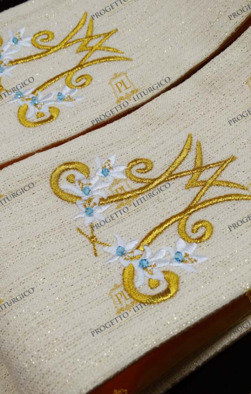 Alla croce ricamata con forme prettamente geometriche si contrappone il ricamo del simbolo mariano per eccellenza, l'AM, dalle forme più morbide. Ma è solo una contrapposizione apparente!