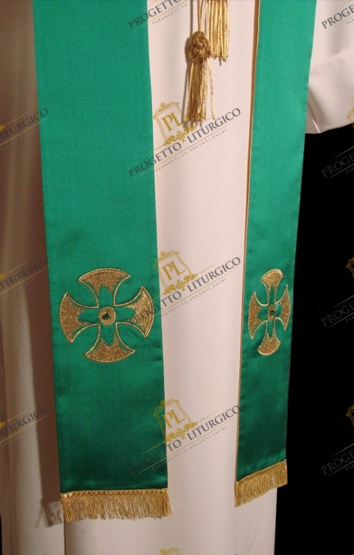 La decorazione è composta da croci ricamate con filato dorato, situate alle estremità dei due lembi della stola e sul collo, al centro di ognuno delle quali è cucito a mano un cristallo verde. Una frangia dorata completa la stola.