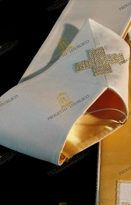 La decorazione di questa raffinata stola sacerdotale bianca è costituita da due motivi geometrici, la croce e il rombo, che si alternano tra loro in un gioco di elementi che coinvolge anche l'impiego di un tessuto diverso: la lana papale nel colore oro bianco si alterna allo shantung di seta lucido e chiaro, come la croce greca ricamata si alterna al rombo.