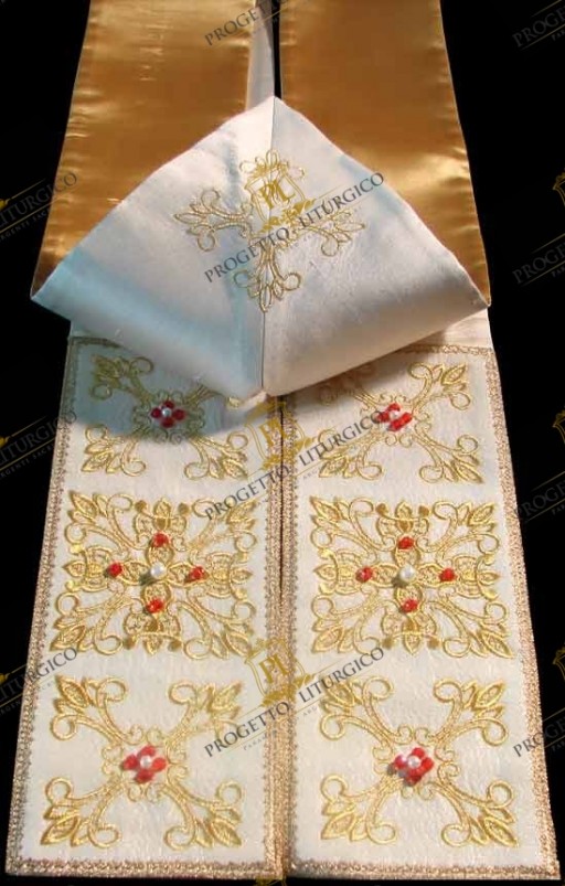 Questa stola sacerdotale bianca è realizzata in pregiata seta shantung e foderata con tessuto di raso dorato. La decorazione della stola è costituita da un bellissimo ricamo realizzato con filato dorato su tessuto di lana papale e incorniciato da un delicato agremano, sempre nei toni del dorato.