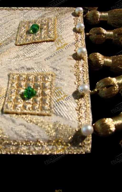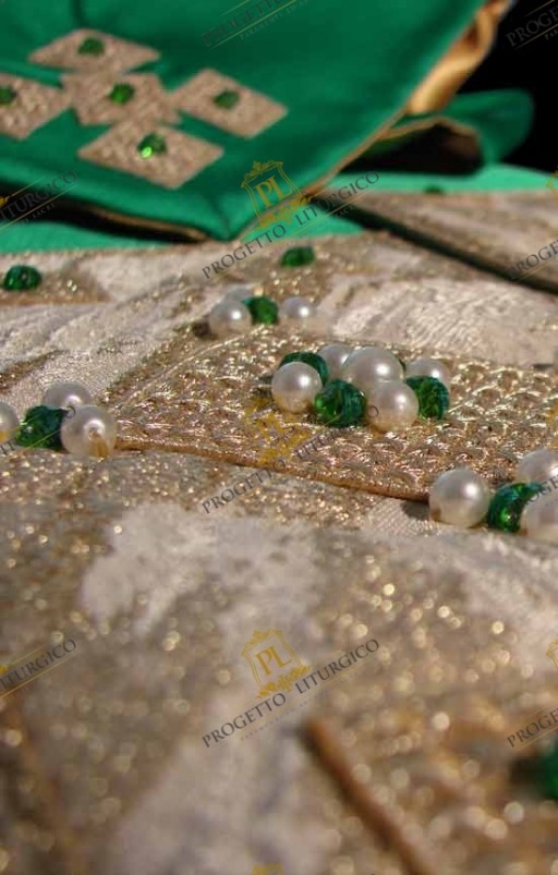 A rendere ancora più preziosa questa stola sacerdotale verde ci sono i 12 fiocchi dorati su ciascuno dei quali vi è una perla.