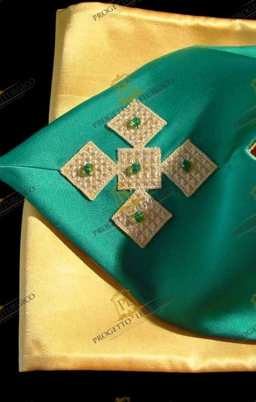 La decorazione geometrica di questa particolarissima stola sacerdotale verde rappresenta una croce stilizzata formata dalla combinazione dell'elemento ricamato centrale e le pietre che sono cucite su di esso.
