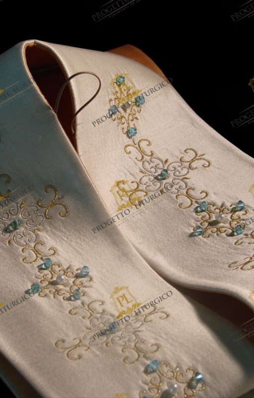 Il ricamo della stola sacerdotale bianca è messa in risalto da un gioco di cristalli del colore del cielo e da candide perle bianche, che rendono questa stola sacerdotale adatta alle festività mariane.