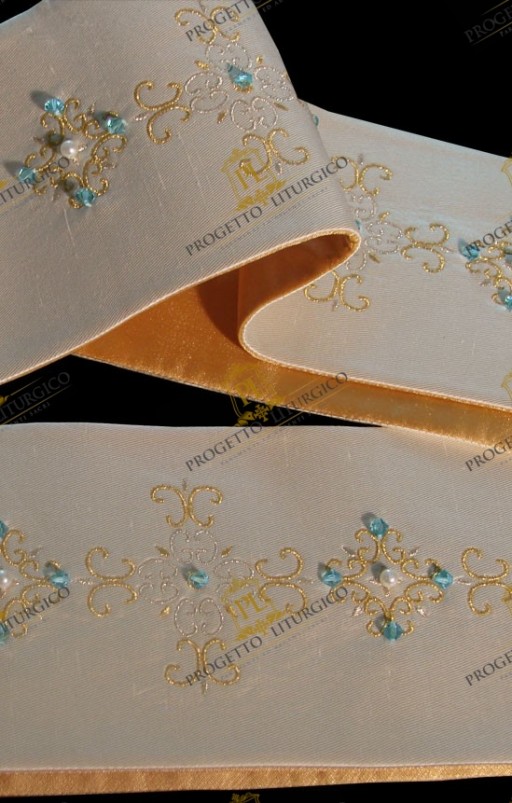 E' ricamata per tutta la lunghezza dei suoi lembi questa preziosissima stola sacerdotale bianca, realizzata in pregiata seta shantung e foderata con raso dorato.