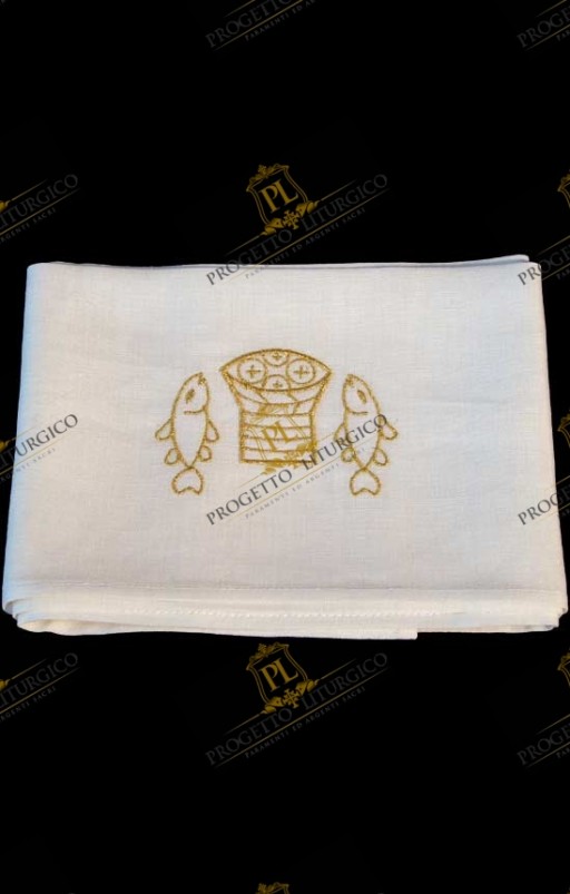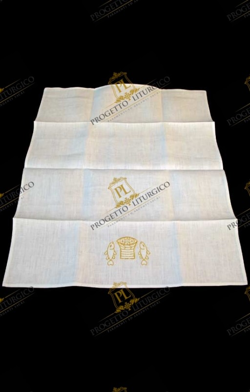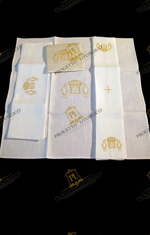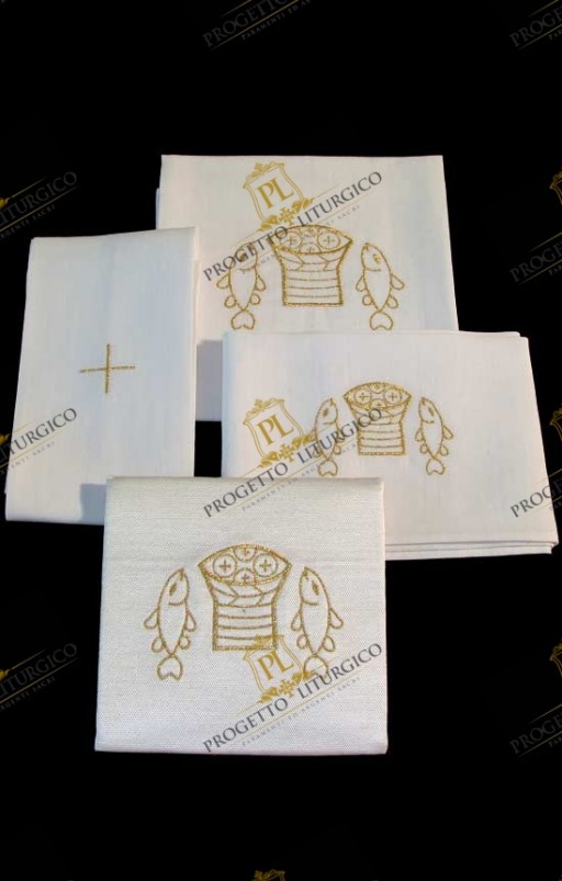 La moltiplicazione dei cinque pani e dei due pesci è il simbolo ricamato con filato dorato su ciascuno dei quattro pezzi che compongono questo servizio da messa in lino.