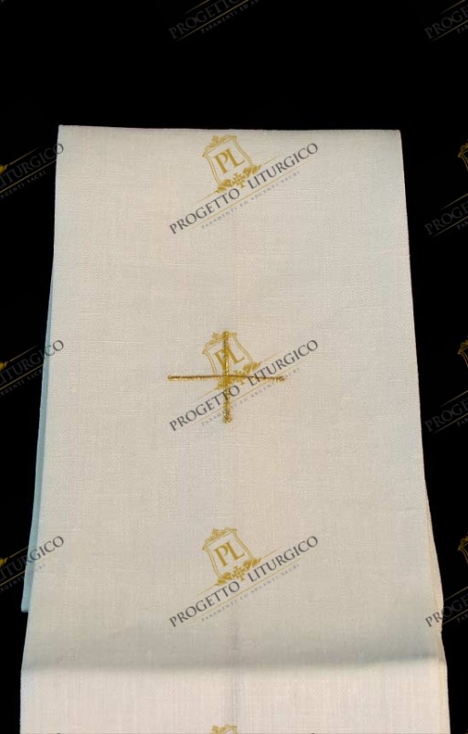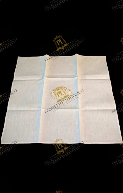 Molto essenziale nella decorazione, il servizio da messa realizzato in pregiato tessuto di lino 100% è composto da tre pezzi: corporale, manutergio e purificatoio e dalla palla liturgica realizzata, invece, in tessuto di seta.