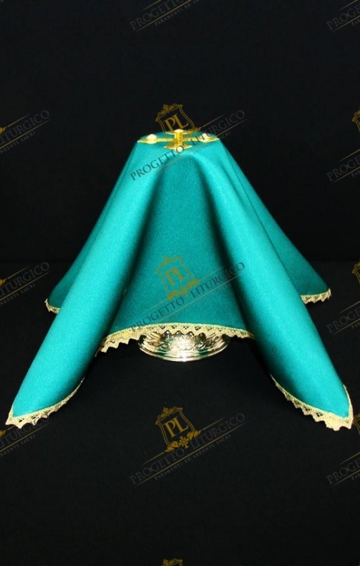 Al centro del velo, una croce ricamata con filato dorato impreziosisce il velo del calice. Tutto il profilo è incorniciato da un delicato bordo in tombolo.