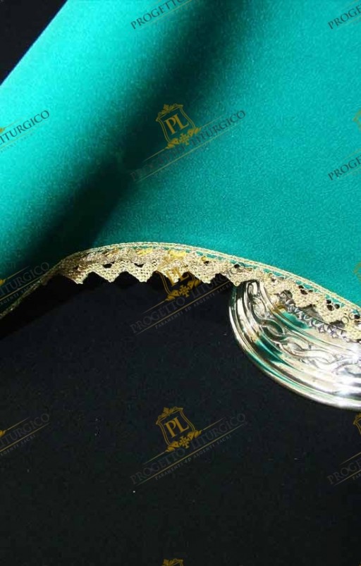 Il velo del calice verde è realizzato in morbido tessuto cady di misto seta, foderato con raso dorato.