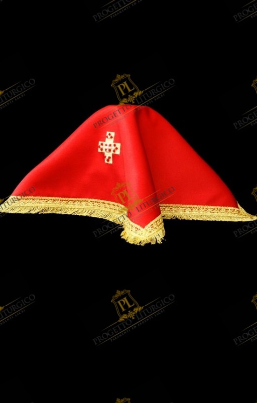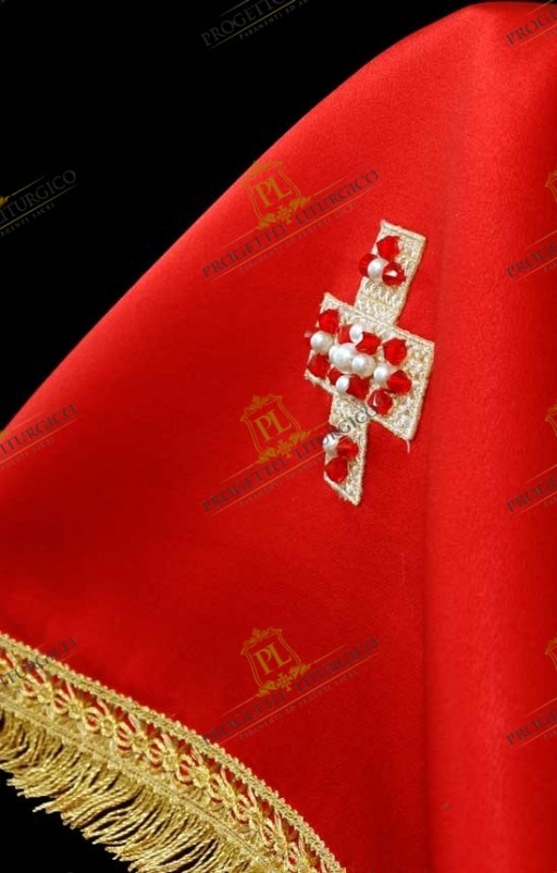 Il velo del calice rosso è realizzato in tessuto cady di misto seta, foderato con raso dorato. Sul davanti una croce ricamata e impreziosita con cristalli rossi e perle, riporta al simbolo del sacrificio di Cristo, di cui il calice raccoglie il sangue.