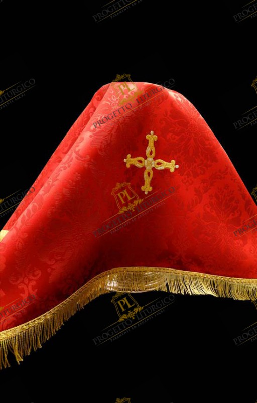The red chalice veil covers the chalice to conceal the mystery of the faith it represents. It is therefore made in such a way as to perform this function, through the choice of fine fabrics and a representative decoration.