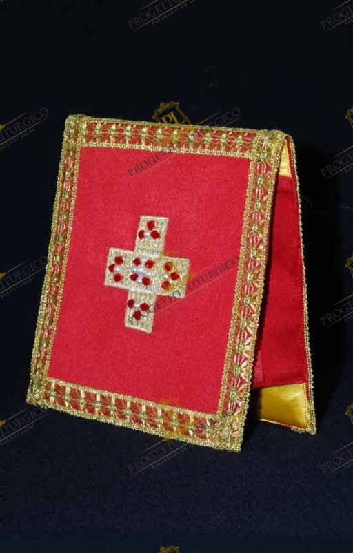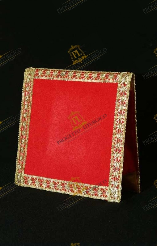 Tutto il profilo della borsa del corporale rossa è percorso da un agremano dorato, sapientemente cucito a mano. Il colore oro, che riprende il tema della sacralità, è ripreso dal raso che riveste l'interno della borsa e che è direttamente a contatto col Corporale.