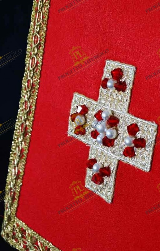 Questa particolare borsa del corporale rossa è realizzata in tessuto cady di misto seta di un bel colore rosso vivo. Essa è decorata semplicemente con una croce ricamata su cui sono cucite a mano cristalli rossi e perle bianche, che mettono in risalto la croce stessa.