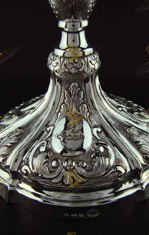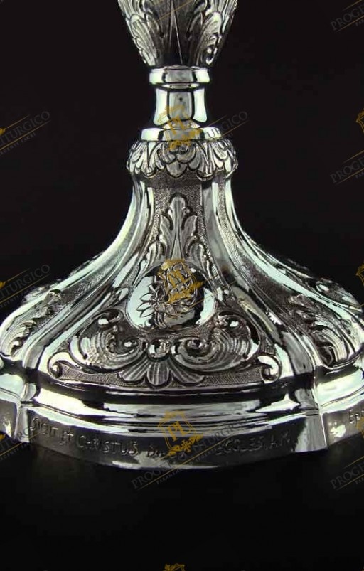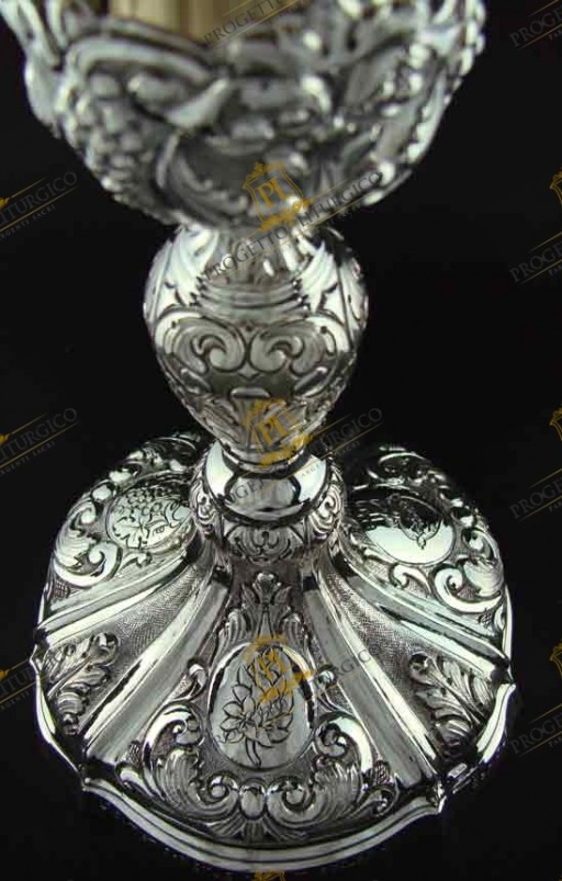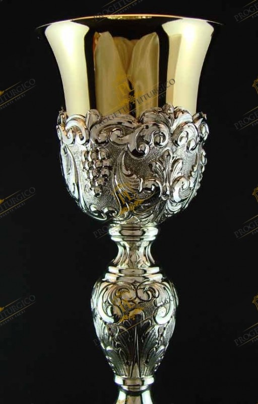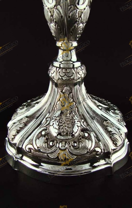 Magnifico calice barocco in argento 925 completamente cesellato a mano. La particolarità di questo calice sta nella decorazione che, tra i motivi barocchi quali le foglie d'acanto e grappoli d'uva, presenta elementi decorativi espressamente richiesti dal committente.