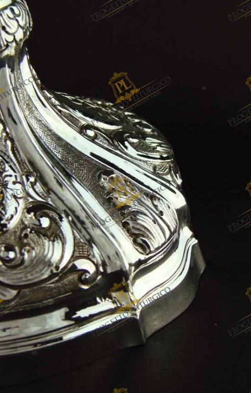 Il fusto, elegante e slanciato, conduce alla base sagomata del calice barocco in argento. Riccamente cesellato con foglie d'acanto e ghirigori barocchi, essa è impreziosita da ovali nei quali sono raffigurati il Sacro Cuore di Gesù, il fiore di nardo, il grappolo d'uva con foglie di vite, elementi decorativi realizzati su espressa richiesta del committente.