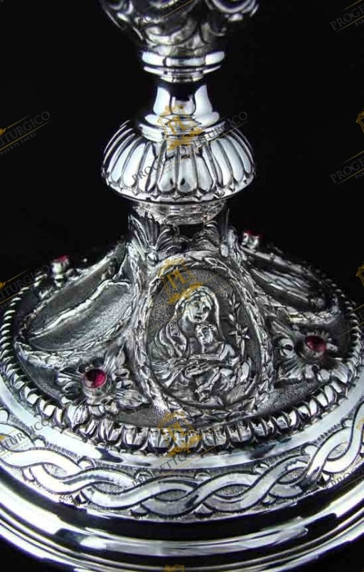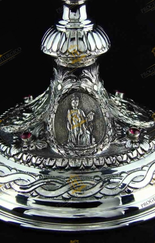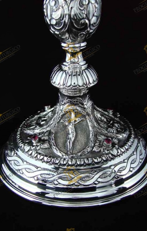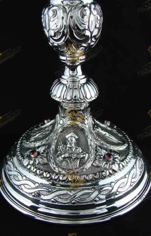 Il fusto del calice barocco, slanciato e di comoda impugnatura, conduce alla base del calice dove i nostri artigiani hanno espresso al meglio la loro sapiente arte. Negli ovali che intervallano gli sbalzi barocchi sono cesellati altri quattro simboli: Il Cristo crocifisso, la figura intera di santa Tecla, il busto di san Filippo Neri, la Madonna col Bambin Gesù. Quattro rubini incastonati alla base del calice barocco contribuiscono a donare preziosità e sacralità al calice stesso.