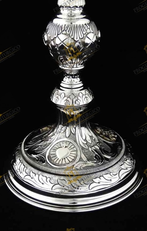 Il fusto, tutto cesellato con i tipici elementi barocchi, conduce alla base del calice barocco, anche questo riccamente cesellato: tra le foglie d'acanto spiccano tre medaglie nelle quali sono raffigurati il Sacro Cuore di Gesù, il simbolo Mariano e il grappolo d'uva, simbolo del sangue di Cristo.