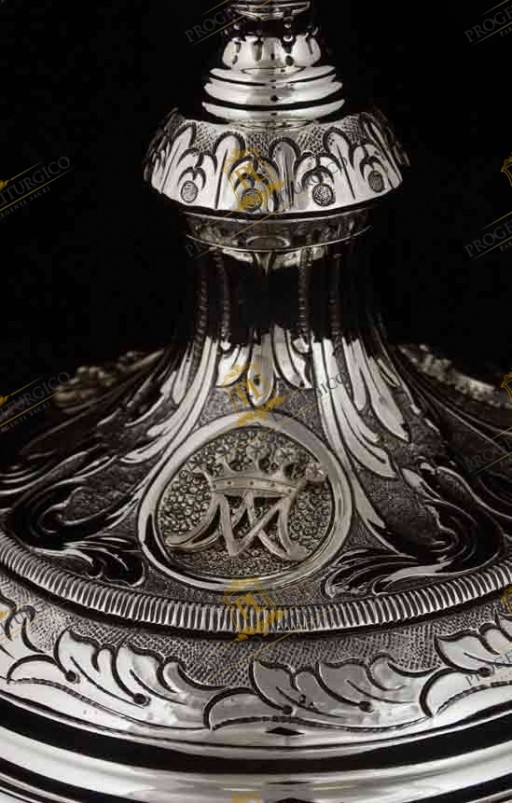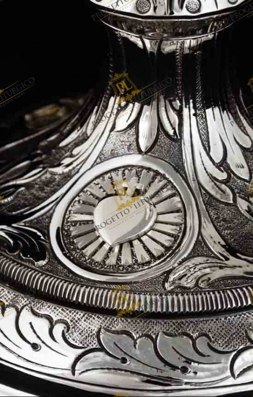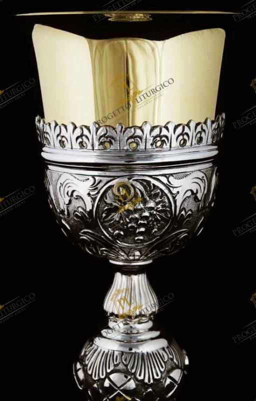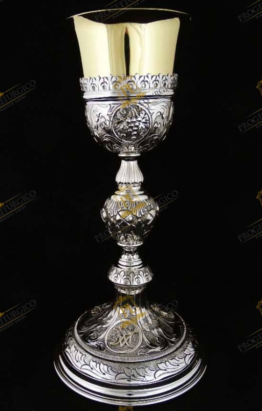 Il calice barocco PL107 è un prezioso esempio del sapiente lavoro del maestro artigiano. Esso è realizzato interamente in argento 925, sia nella struttura esterna che in quella interna. Non si tratta, infatti, di un calice realizzato in fusione, ma di un lavoro realizzato completamente a mano, composto da più pezzi e decorato rispettando le precise indicazioni del committente.