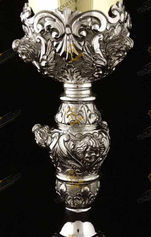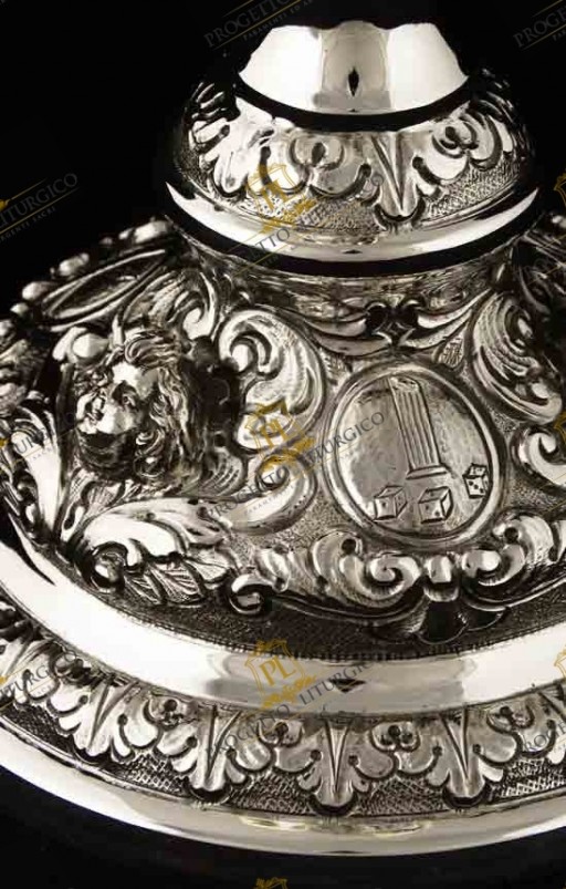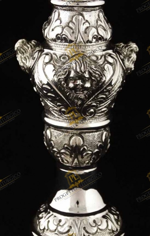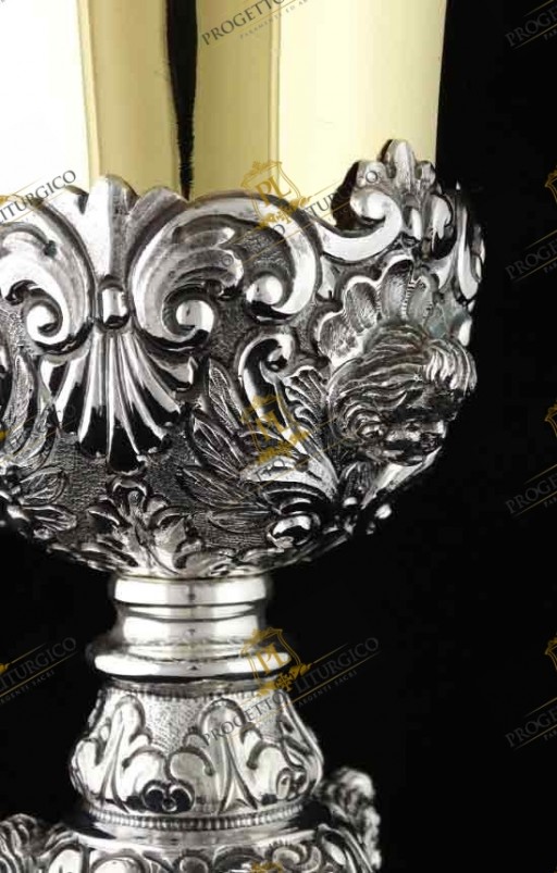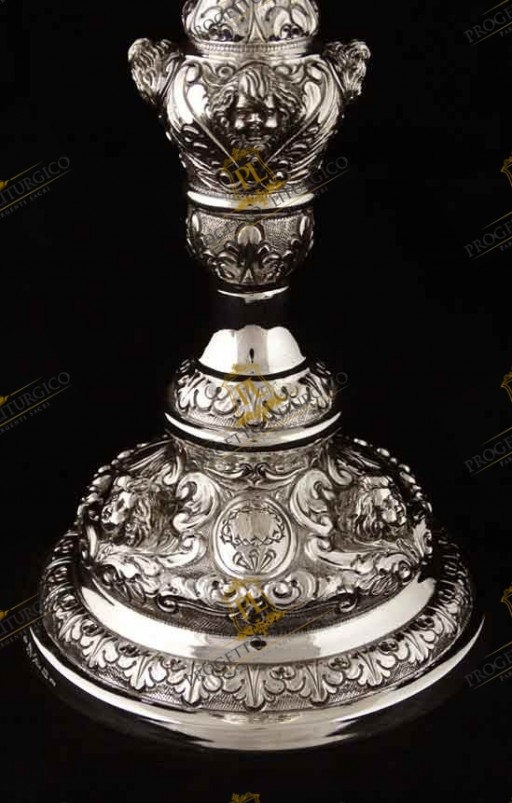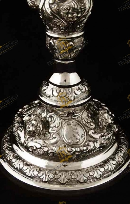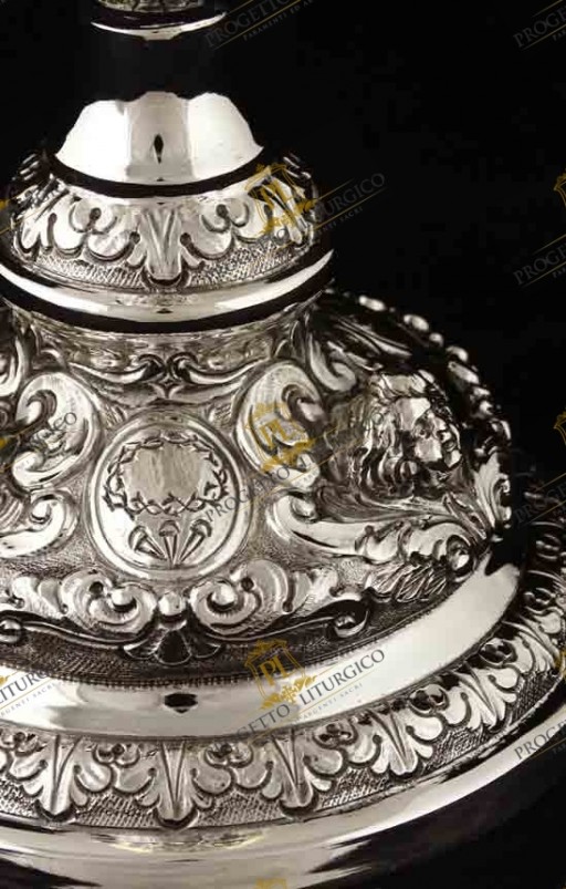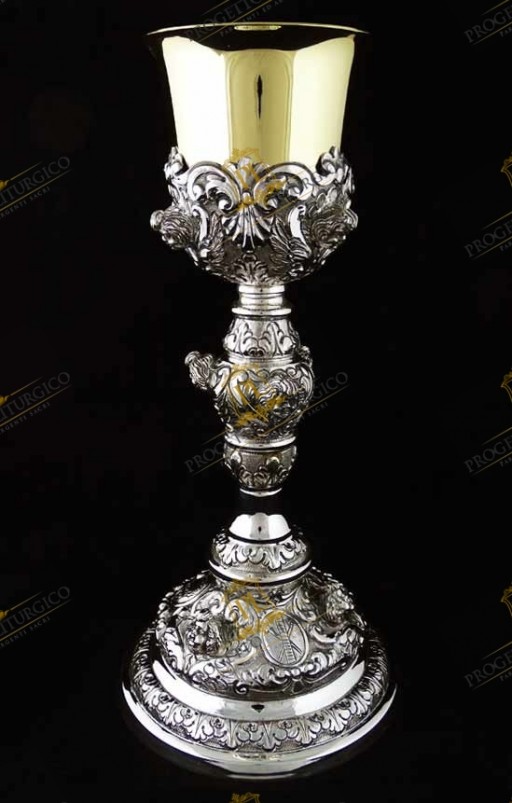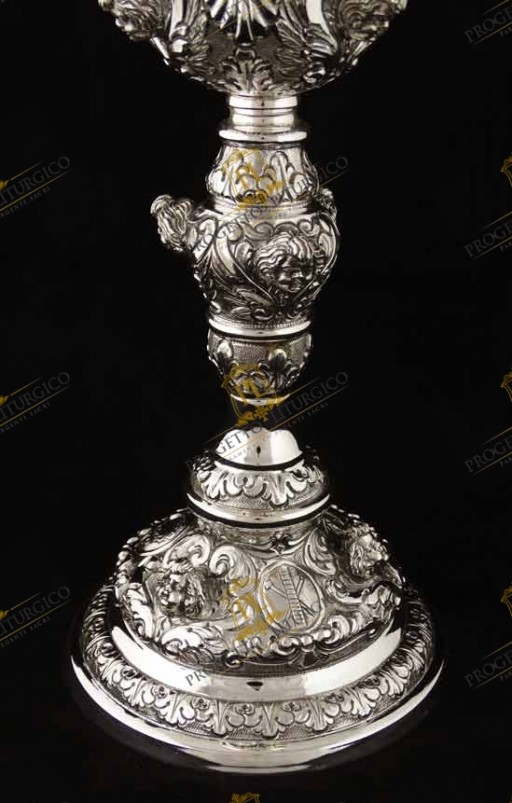 Il calice barocco PL109 è realizzato interamente in argento 925. Lo stile è quello tipico barocco, con volute e motivi floreali tra i quali trovano posto e risaltano le teste d'angelo sbalzate.