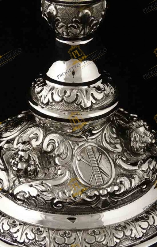 Ritroviamo il motivo degli angeli sia sul fusto, sia sulla base del calice barocco, dove troviamo incisi alcuni simboli della Passione di Cristo, quali la colonna del flagello, i dadi, la corona di spine.