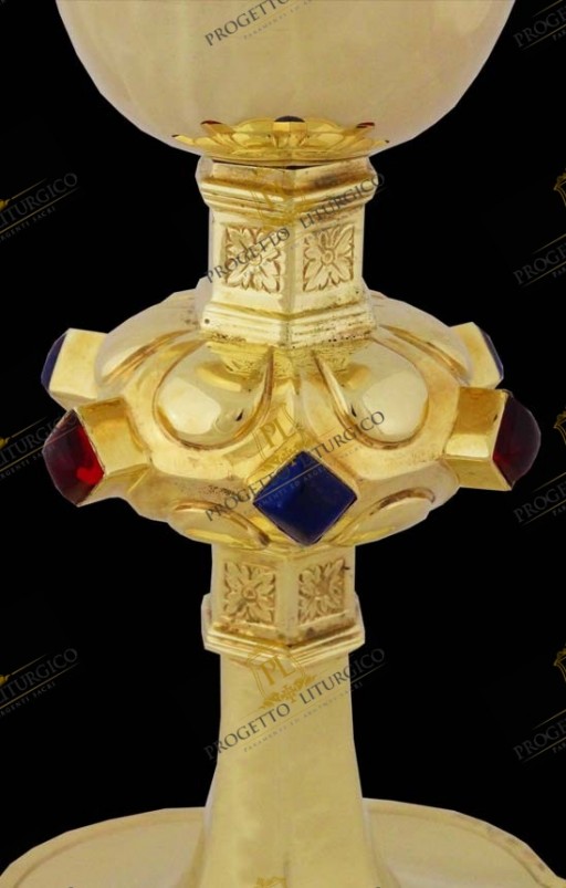 Il calice gotico dorato si caratterizza per la sua imponenza e per l'essenzialità dei suoi decori. L'unico elemento decorativo è rappresentato dal pomolo, collocato sul fusto, sfaccettato e impreziosito con lapislazzuli blu e rubini rossi. La base del calice è smerlata.