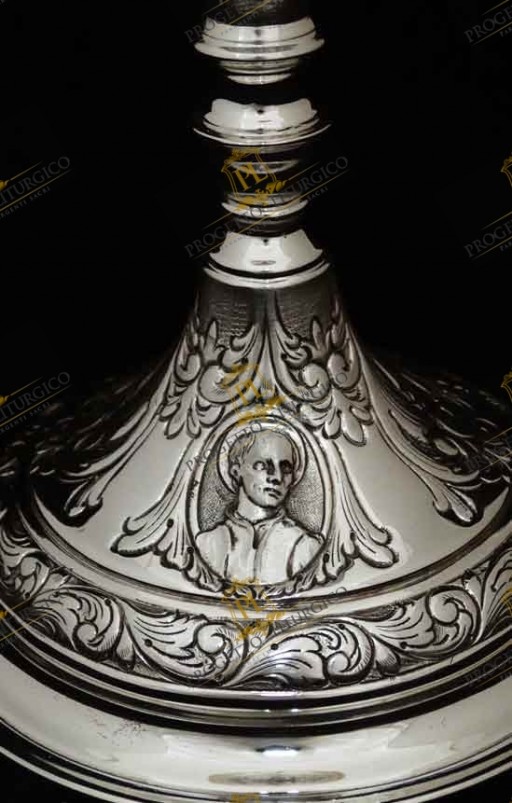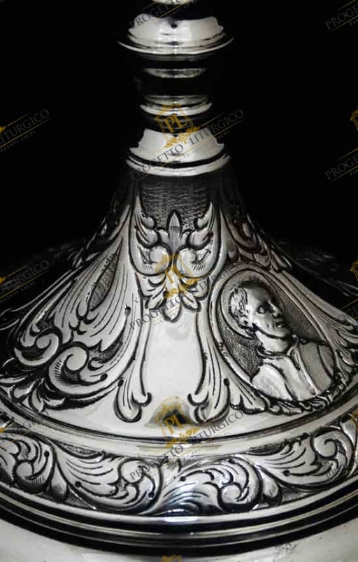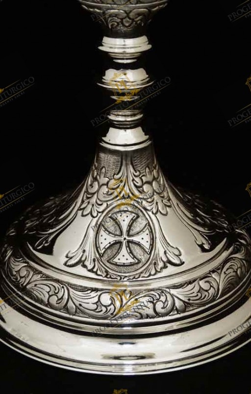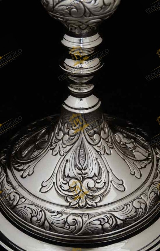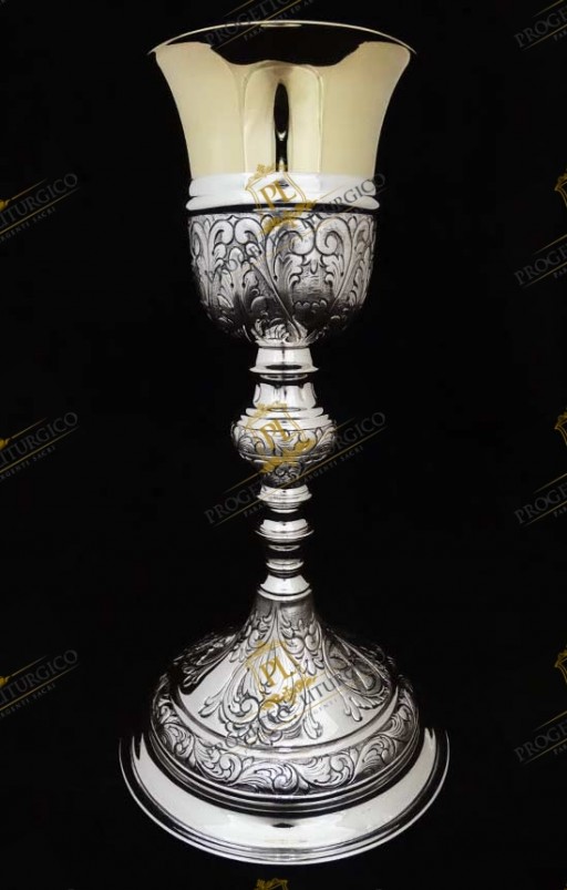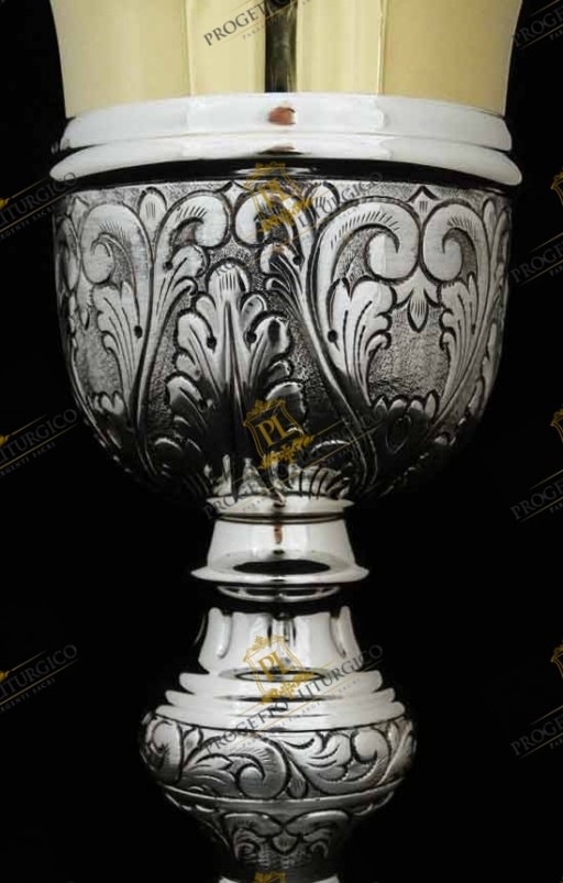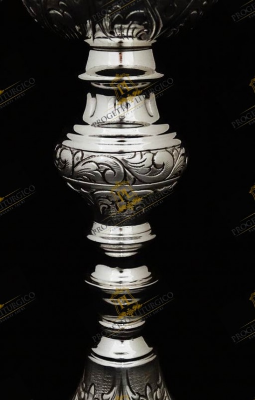 Il calice da messa PL118 è realizzato interamente in argento cesellato a mano. La particolarità di questo calice da messa sta nello stile in cui è stato lavorato: un barocco abbastanza lineare.