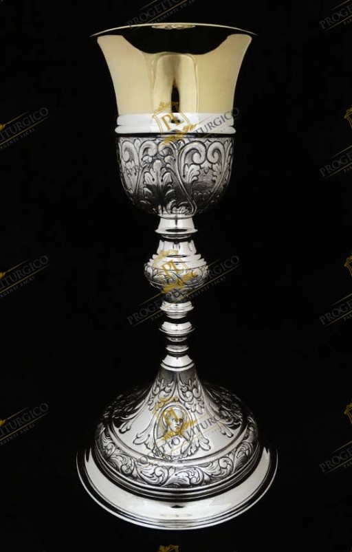 La resa plastica dei motivi floreali che caratterizzano questo calice è dovuta ad un sapiente lavoro di cesellatura e di brunitura dell'argento.