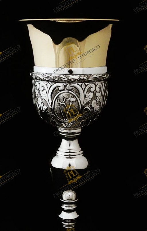Il calice in argento con simbolo dei padri Passionisti è cesellato interamente a mano in uno stile barocco abbastanza semplice e lineare.