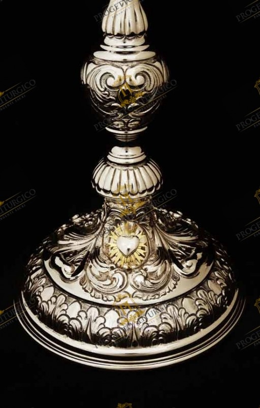 All'incisione della Madonna con Bambino corrisponde sulla base del calice liturgico in argento il cuore immacolato con raggi dorati.