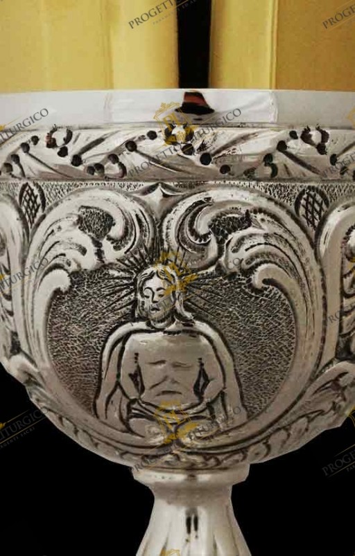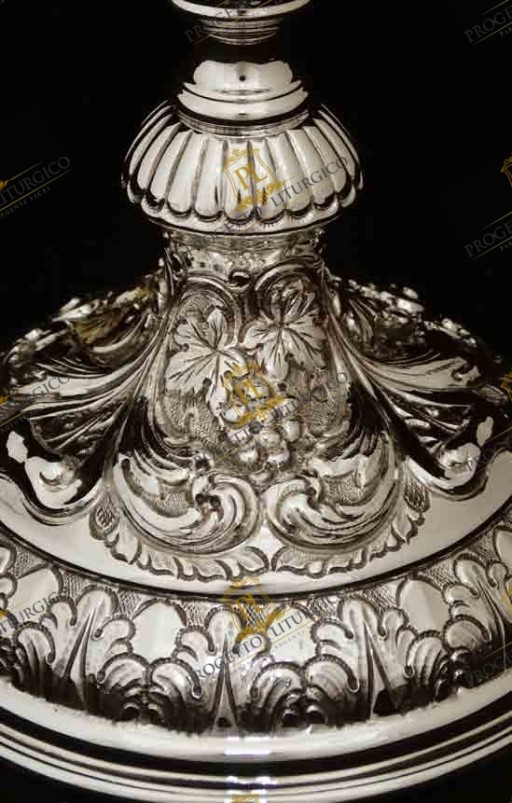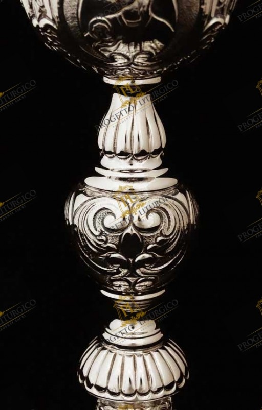 Il prezioso calice liturgico in argento cesellato a mano in stile barocco presenta elementi decorativi personalizzati.