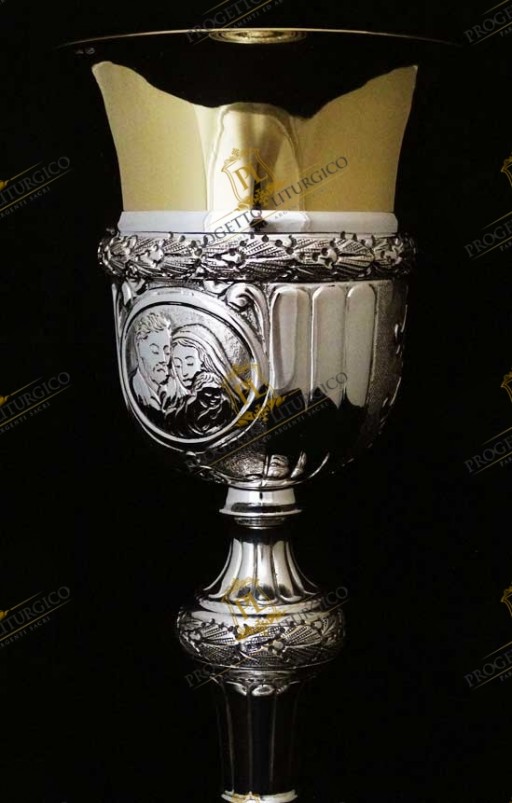 Ciò che cattura lo sguardo dell'osservatore è la meravigliosa Sacra Famiglia cesellata sul sottocoppa del calice da messa.