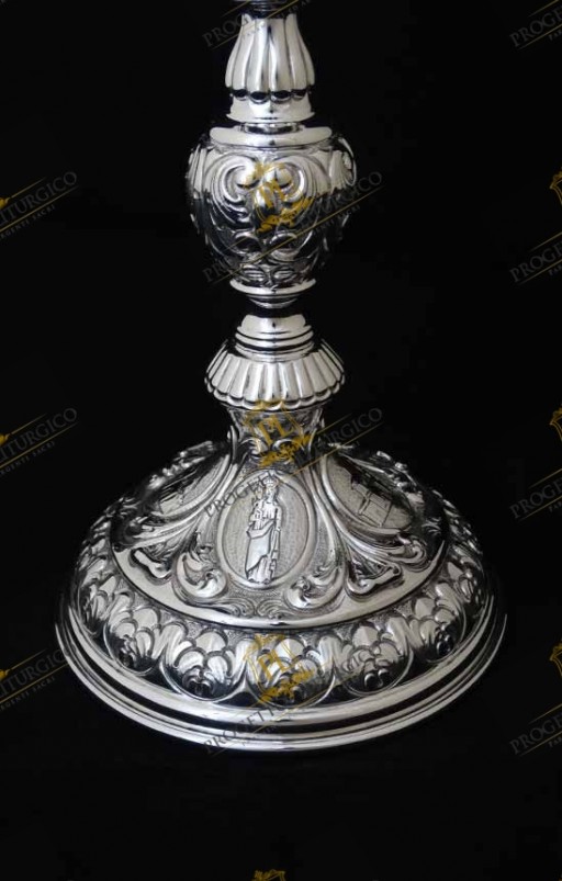 I decori che adornano questo prezioso calice sacro con agnello sono ispirati allo stile barocco. Troviamo così cesellati motivi floreali ed altri ghirigori tipici barocchi sul sottocoppa, lungo il fusto e sulla base di questo meraviglioso calice sacro con agnello.