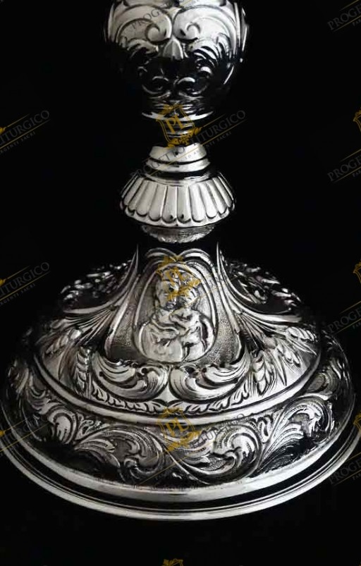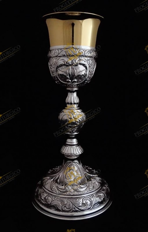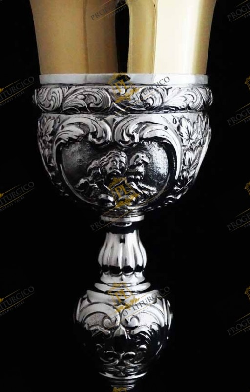 Il calice liturgico in argento è cesellato rigorosamente a mano seguendo uno stile barocco di base, nel quale si incastrano alla perfezione motivi personalizzati come il buon pastore con la pecora sulle spalle, il pellicano nell'atto di ferirsi il petto, i cervi che si abbeverano alla fonte e altri.