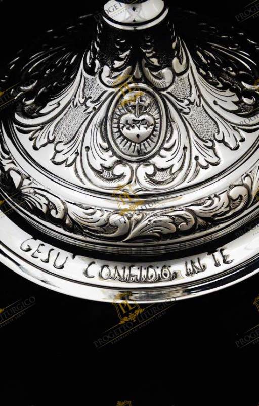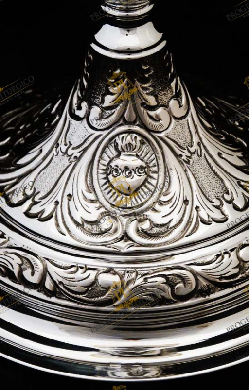 Sul sottocoppa, che supporta la coppa dorata, prende posto l'Agnello, magistralmente sbalzato a mano; sulla base invece, in due ovali differenti sono raffigurati i Sacri cuori di Gesù e di Maria.
