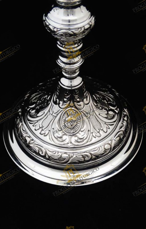 La decorazione che impreziosisce questo grazioso calice sacerdotale in argento prende spunto dai motivi floreali tipici dello stile barocco. Tra foglie di acanto e ghirigori vari, trovano posto dei piccoli ovali che recano sbalzi personalizzati secondo il gusto del committente.
