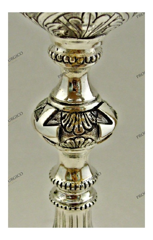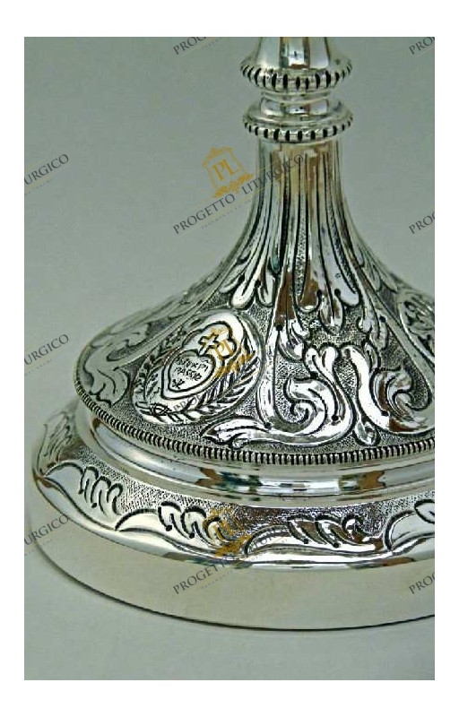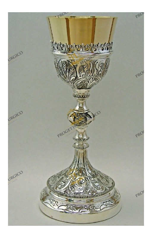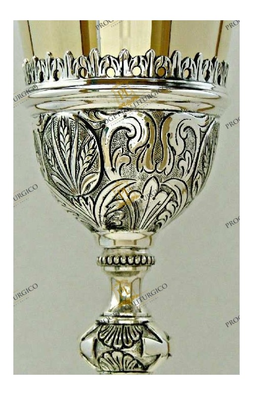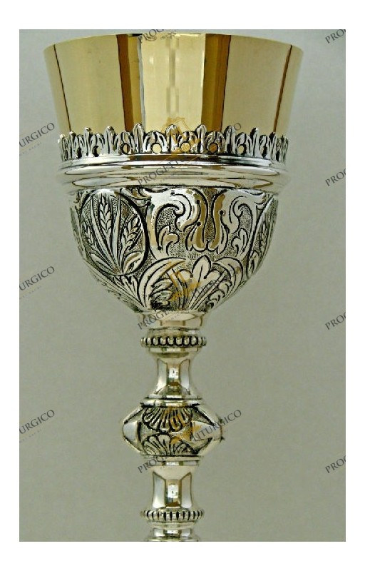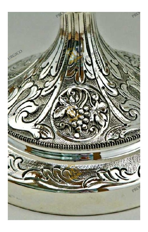 Questo calice in argento 925 è stato cesellato a mano per ottenere una decorazione solenne e simbolica. Infatti oltre agli sbalzi e le foglie d'acanto tipiche delle decorazioni barocche, il calice in argento è decorato con spighe e grappoli.