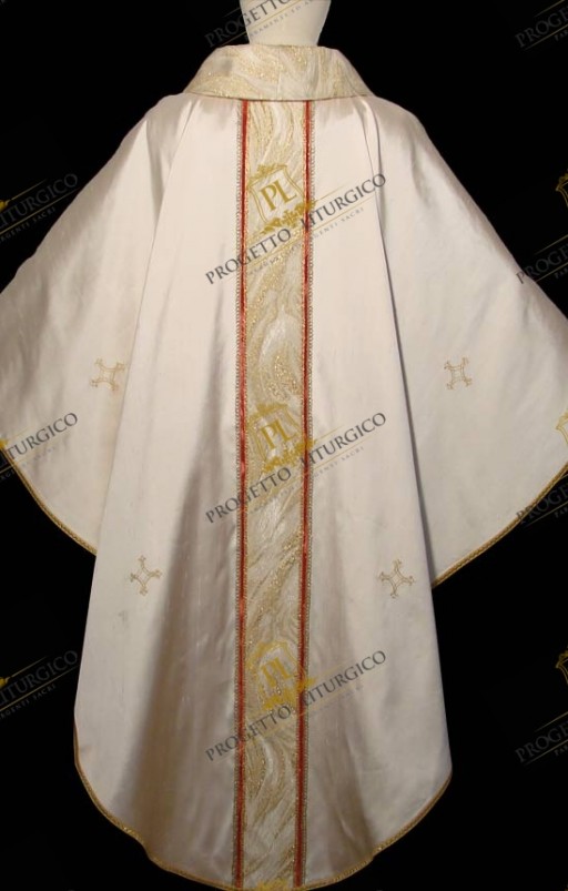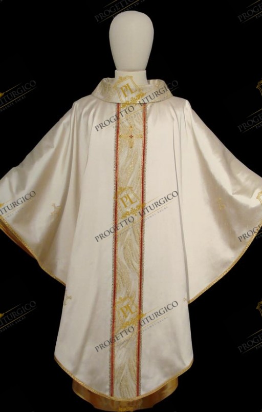 La casula bianca che qui mostriamo è realizzata in morbida e preziosa seta shantung e foderata con tessuto di raso dorato. Il collo tondo e gli stoloni sono, invece, realizzati in un tessuto broccato dorato dal particolare disegno "a fiamme". Sul davanti, lo stolone è adornato con una croce ricamata, a sua volta discretamente impreziosita con cristalli cuciti a mano.