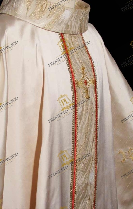 Sia lo stolone del davanti, sia quello del dietro sono rifiniti con un nastro di velluto rosso a cui sono accostati due diversi tipi di agremani dorati, donando alla casula bianca non solo un tocco di colore ma soprattutto un importante valore simbolico.