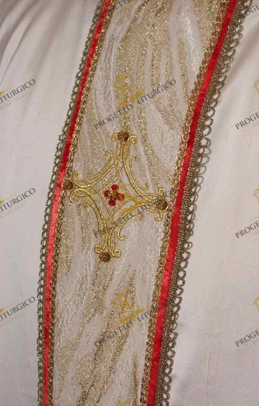 La stola sacerdotale è realizzata con la stessa seta della casula bianca e foderata con lo stesso raso dorato. Sul fondo della stola è presente la decorazione costituita dalla stessa croce ricamata sullo stolone, realizzata sullo stesso broccato e incorniciata dallo stesso gioco di nastro di velluto e agremani.