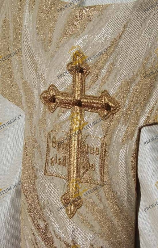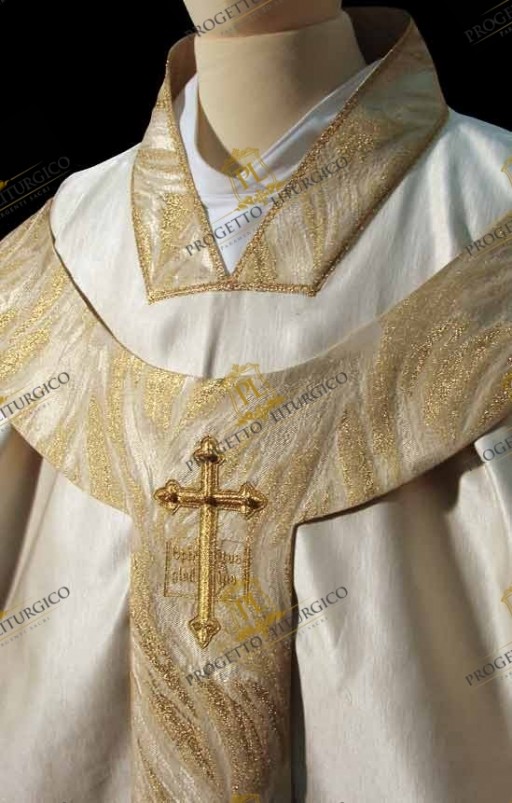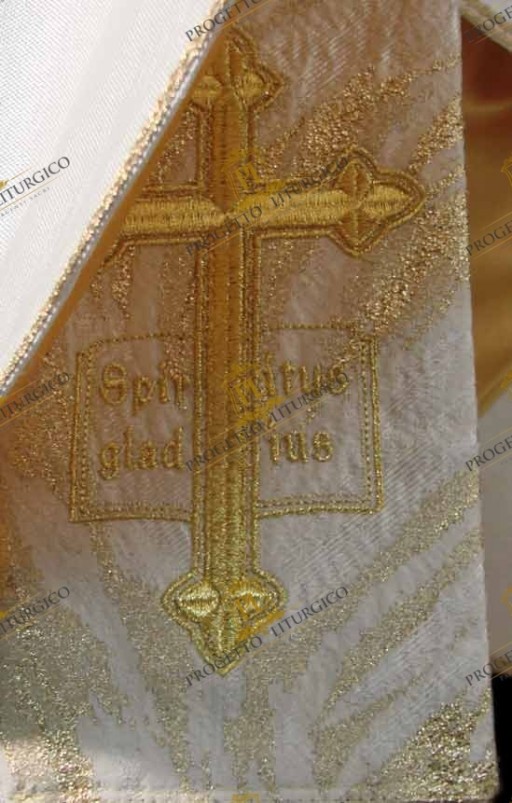 La stola sacerdotale abbinata a questa casula bianca gotica è decorata su entrambi i lembi con la stessa croce ricamata presente sul pallio. Dei fiocchi dorati cuciti a mano alle estremità, donano solennità alla stola.