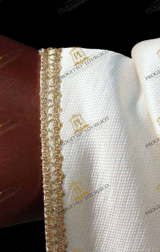 Lungo tutto il perimetro della casula bianca gotica, infine, è stato cucito un delicatissimo agremano dorato.