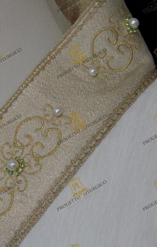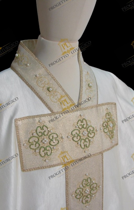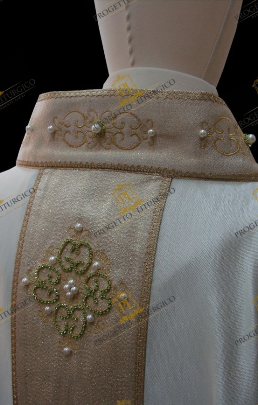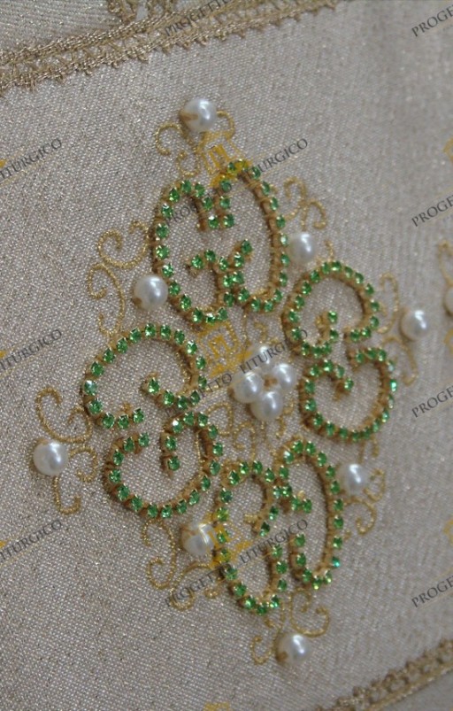 Disegnata appositamente per una Reale Basilica dedicata al culto della Madonna, questa casula bianca gotica presenta una particolare decorazione ottenuta dalla combinazione di ricamo e applicazione di cristalli verdi e perle, tutti rigorosamente cuciti a mano.
