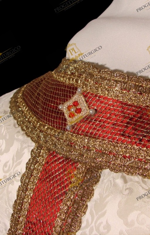 Lo scollo quadrato, ampio e comodo, e gli stoloni sono realizzati in mikado di seta rossa con cui si è creato un gioco di contrasti grazie alla combinazione di agremani dorati diversi. Il risultato finale è quello di un paramento liturgico ricercato e solenne.