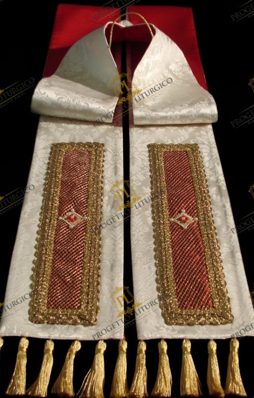 Anche la stola sacerdotale ha la sua importanza: realizzata nello stesso tessuto damascato della casula bianca, è foderata in tessuto di raso rosso e termina con fiocchi dorati, leggermente sporgenti dal capo.