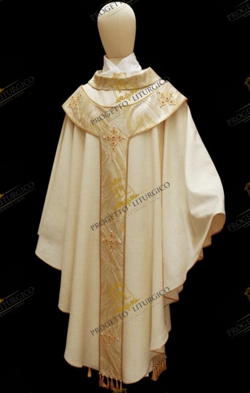 Il corpo della casula bianca è realizzata in un particolare tessuto di lana laminata con filo dorato, mentre il collo tondo è realizzato con tessuto di contrasto, un pregiato broccato dalle fiamme dorato.