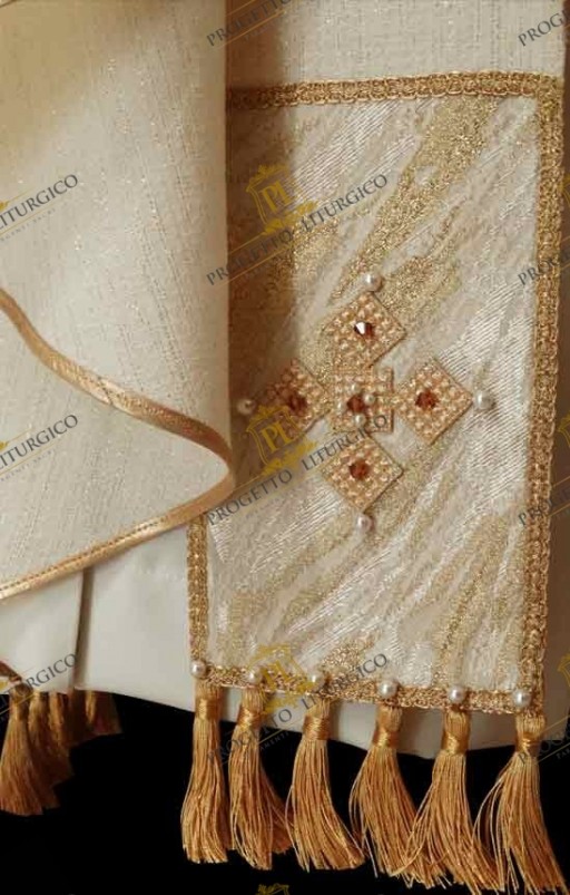 Lo stesso broccato dorato è stato utilizzato per la realizzazione del pallio che adorna questa casula bianca, impreziosito con croci ricamate e pietre cucite a mano. Tutto il profilo del pallio sacerdotale è percorso da una passamaneria dorata molto raffinata; solo sul davanti del pallio, sono cuciti a mano dei fiocchi in oro mezzo fino, e su ciascun fiocco una perla bianca.