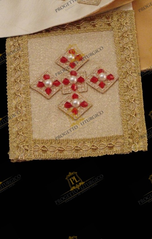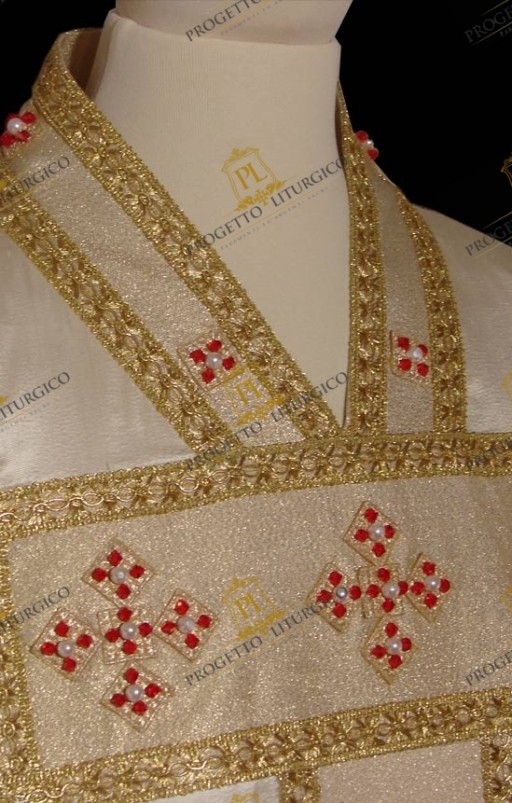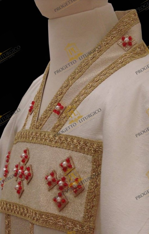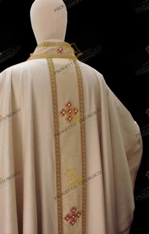 Il davanti della casula bianca gotica è decorata con il classico tau su cui sono collocate delle croci ricamate e adornate con cristalli rossi e perle, che donano alla casula un tono più solenne.